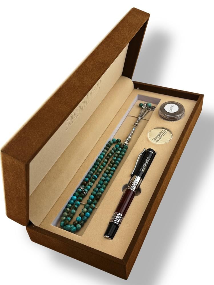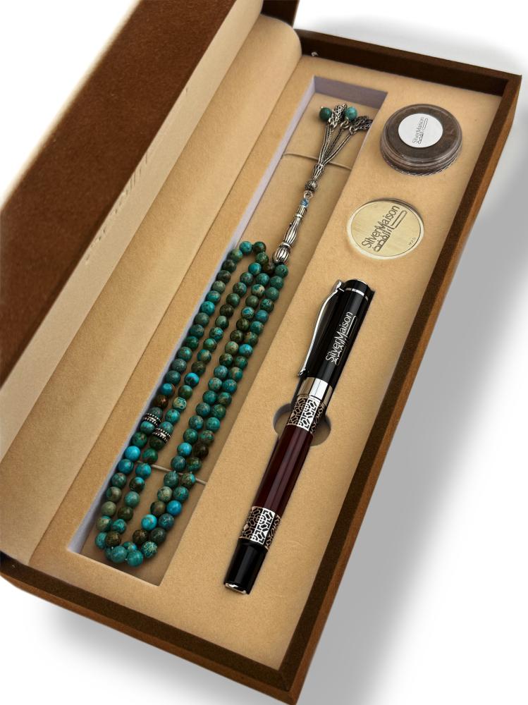مجموعة هدية فاخرة – سبحة حجر طبيعي ، قلم أنيق ، عودة فاخرة + قطعة فضة هدية دائرية الوزن : 8 جرام ( بدون الشعار )