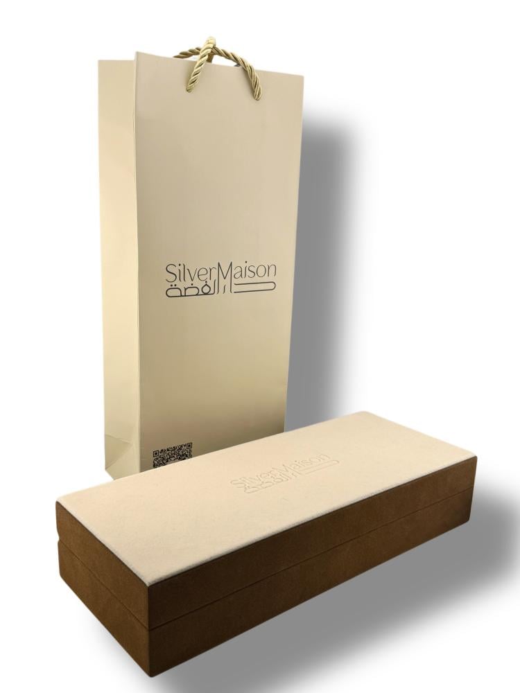 مع إمكانية طباعة اسم أو شعار على القطعة الفضة الدائرية بمبلغ إضافي .