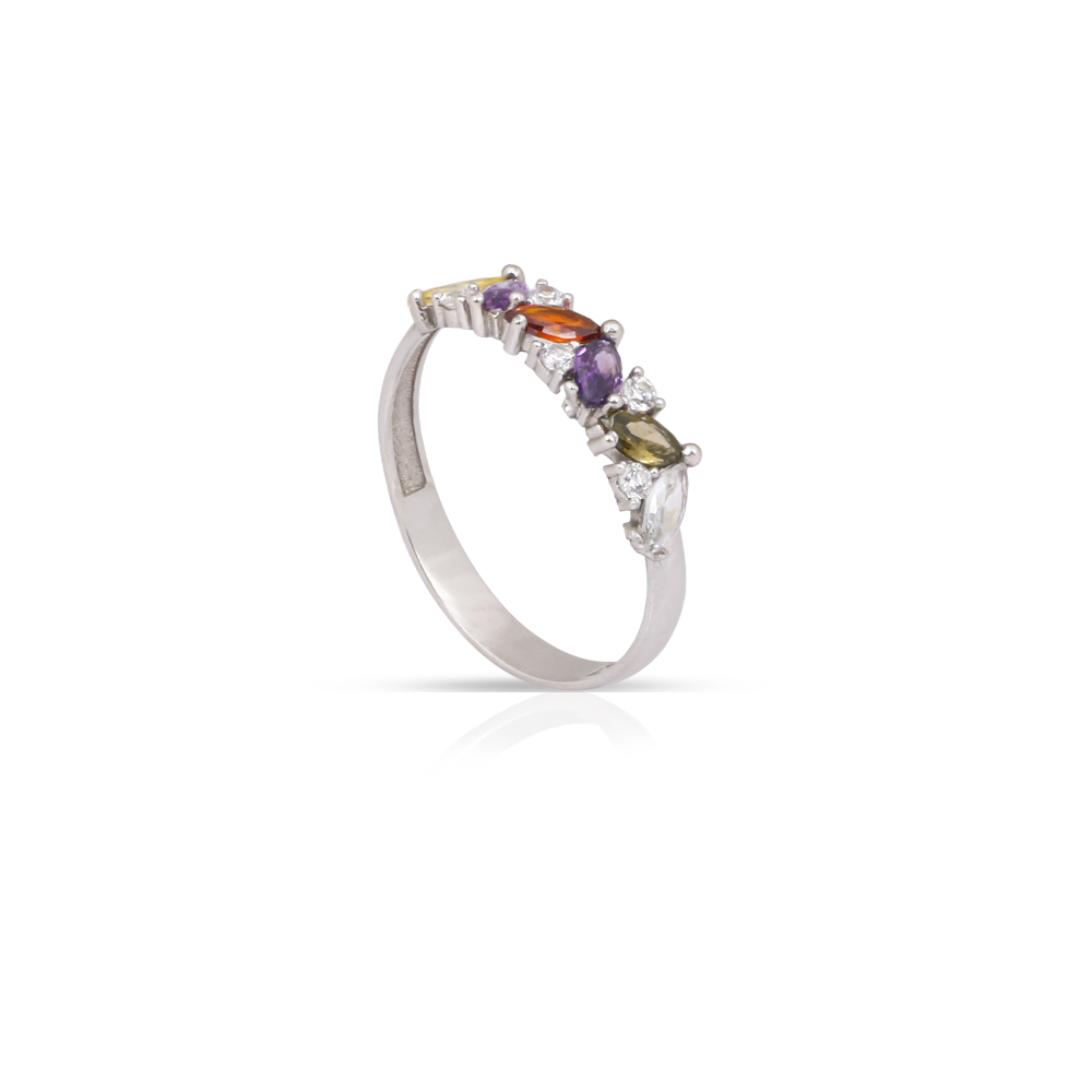 خاتم فضه فصوص ملونه قطعة استثنائية لكل امرأة عصرية تبحث عن الأناقة والجمال في آن واحد، مصنوع من الفضة الخالصة عيار 925، مطلي بطبقة من الروديوم للحفاظ على بريقه ولمعانه ومتانته لأطول فترة ممكنة، مُرصع بأحجار زركون ملونة وزاهية تُضفي لمظهرك لمسة من البهجة والسعادة، يمكن تنسيقه مع تشكيلة واسعة من الملابس لتتألقي بشكل مذهل في جميع مناسباتك.