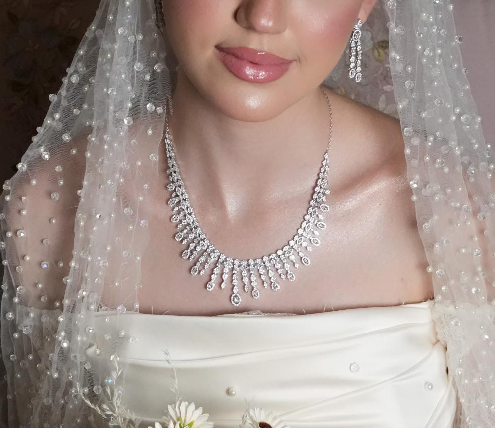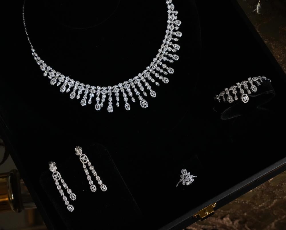 أضيفي لمسة من الأناقة والرقي إلى إطلالتك مع هذا الطقم الفاخر المصنوع من الفضة النقية عيار 925، بتصميم راقٍ وجودة تضاهي الماس.