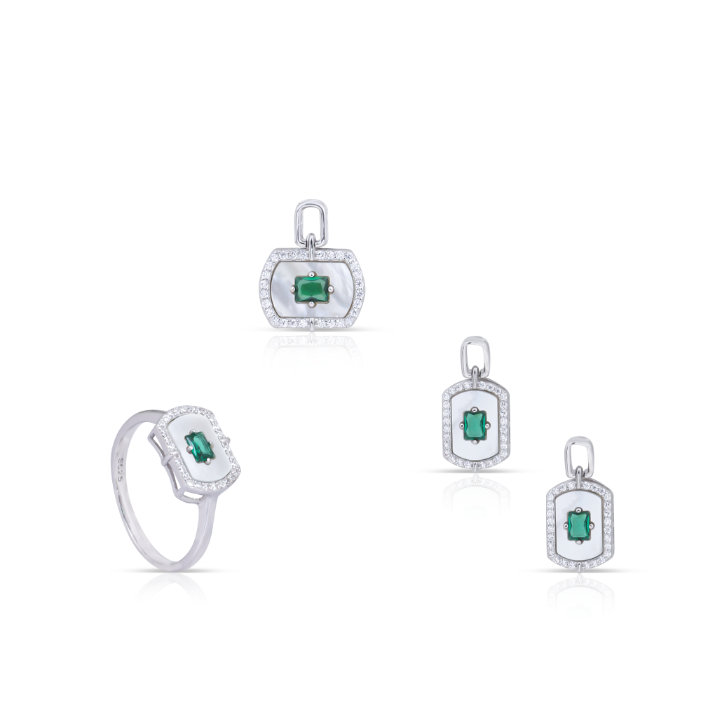 - التصميم: يتكون الطقم من أقراط وخاتم مزينين بصدف طبيعي وحجر زمردي أخضر، مما يمنحك إطلالة أنيقة ومميزة.