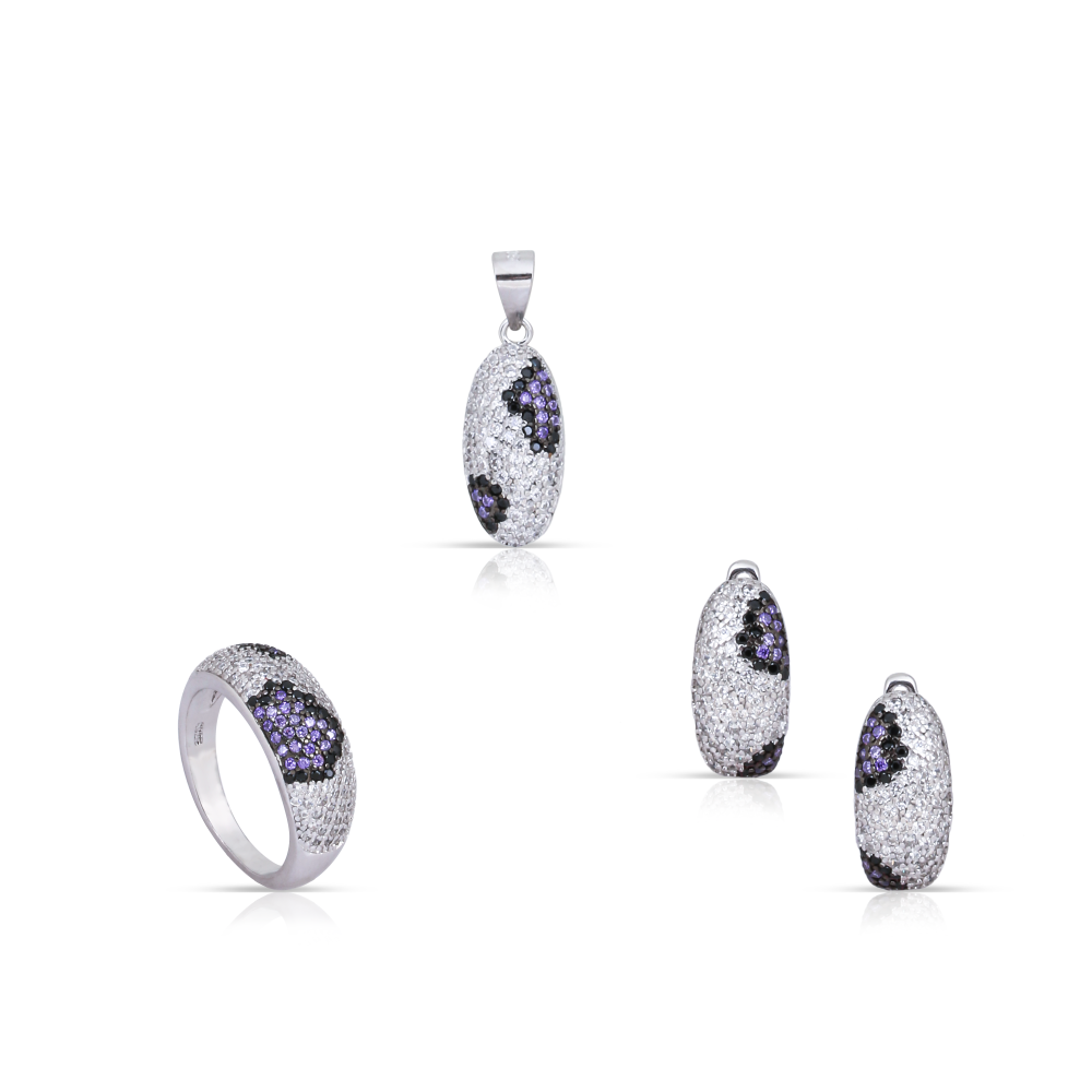 - التصميم: يتكون الطقم من أقراط وخاتم مزينين بتصميم بيضاوي مع فصوص زركون لامعة، بينما يُضاف اللون الأرجواني الجذاب ليكمل التأثير الفاخر.